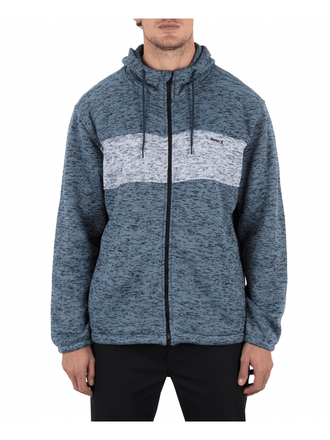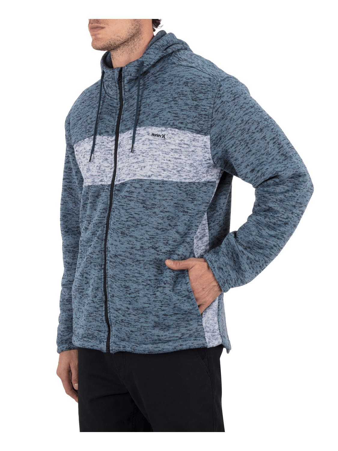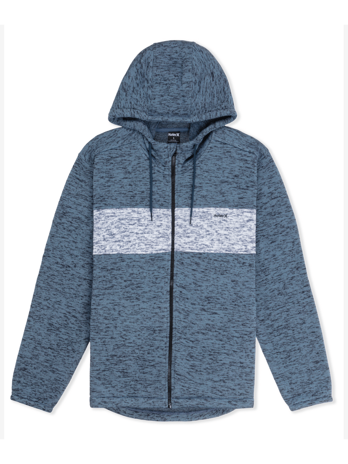 - Hooded full zip silhouette with drop tail hem.